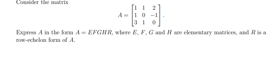 Vee is right because if you multiply the inverse of A by As corresponding elementary matrices the product is the identity matrix. I have been stuck of this problem forever if any one can help me out it would be much appreciated. BWrite A as a product of elementary matrices.